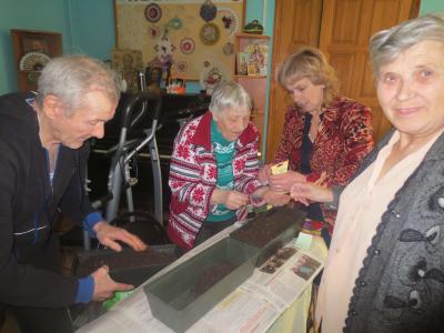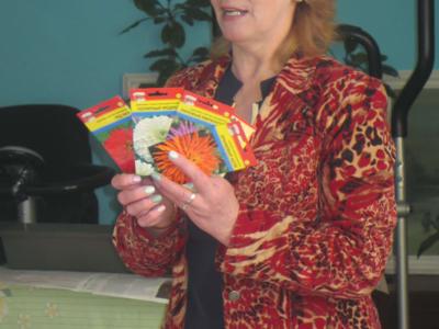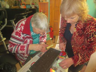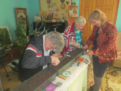 За период, с начала работы, в этом направлении определилась инициативная группа в составе Астаховой Анны Никаноровны, Михайловой Марии Ивановны, Стеглова Евгения Ивановича, Кондратовой Ольги Васильевны. Они не только проявили заинтересованность к данному виду деятельности, но и принимают самое активное участие при работе с семенами. Предварительно изучается агротехника выращивания того или иного вида растений, особенности ухода за растениями. Затем по личному выбору и предпочтению распределяются сорта между желающими. Так Астаховой А.Н были высеяны однолетники семейства циний: «Ред Мен», «Оранжевый Ацтек», «Снежный человек». Михайлова М. И. посеяла цинии «Лиловый Император». С интересом и большим желанием подошел к посевной Стеглов Е. И., выбравший цинии «Полярный медведь», «Алое пламя». Не остались в стороне и другие получатели социальных услуг. Королевич В.Д. и Табола А.Н. готовили емкости с землей и помогали друг другу советами.