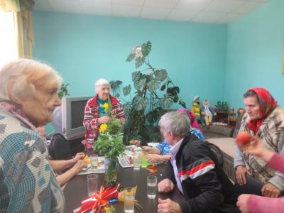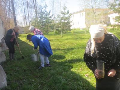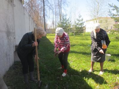 В первой его части были посажены пророщенные веточки вербы. Погода способствовала, добавляла настроения и прибавляла сил. Астахова Анна Никаноровна - одна из самых активных получателей социальных услуг, бережно опуская веточки с нежными хрупкими корешками в землю, прочитывала «Отче наш» для лучшего приживания молодых побегов. Кто-то поливал, другие просто были моральной группой поддержки, добрым словом.