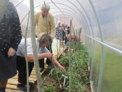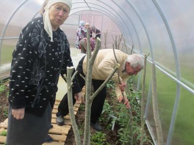 Обязательным условием выращивания помидоров является подвязка томатов в теплице. Она нужна для того, чтобы высокорослые растения не сломались под тяжестью своего веса, этим и решили заняться слушатели школы «Гарденотерапии». Предварительно были подготовлены опоры и в назначенный час 15 самых активных садоводов-огородников оживленно занялись процессом подвязывания растений. Кто-то из личного опыта предложил оборвать боковые побеги на растении, называемые пасынками. Пасынки растут из пазух листьев, а не на голом стебле. Они способствуют разветвлению куста, что очень затеняет растение, распространяет заболевания, сокращает срок созревания плодов, поэтому решили пасынковать помидоры. Егорова Раиса Алексеевна сказала, что в этом нет ни чего сложного, нужно просто отламывать пасынки.