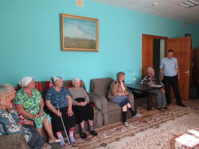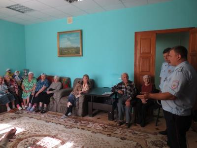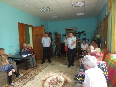 Пожилые люди зачастую забывают или пренебрегают основными правилами дорожного движения, не всегда пользуются пешеходными переходами или сигналами светофора при переходе улицы. Чтобы движение на дорогах для них было действительно безопасным, необходимо постоянно «освежать в памяти» эти знания, говорить о скрытых опасностях. С этой целью был приглашен инспектор по пропаганде безопасности дорожного движения ОГИБДД МО МВД РФ "Вяземский" Бабичев Владимир Сергеевич, который 10.08.2017 г. прочитал лекцию для проживающих стационарного отделения и сотрудников учреждения на тему: «Правила поведения на дорогах». Компетентно и в доступной форме донес до слушателей основные правила бдительного поведения на улице. Инспектор сообщил о главном правиле безопасности – никогда не спешить! Переход дороги начинать только при полном открытом обзоре дороги с обеих сторон.