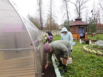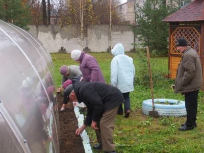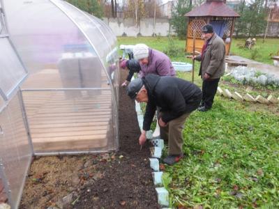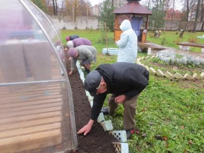 Дождливым осенним утром 31.10.2017 г. участники школы «Гарденотерапия» не стали грустить и сетовать на природу, а решили использовать непогоду в свою пользу. На очередном занятии по гарденотерапии решили высадить озимый чеснок. Посадка чеснока под зиму обеспечивает отличное качество, обильный урожай и большой размер головок. Предварительно была подготовлена почва, внимательно осмотрен чеснок, а головки разобраны на отдельные зубчики. Несмотря на моросящий дождь, под шутки-прибаутки и жаркие споры по поводу глубины лунок и расстояния между ними, пришли к единому мнению и шесть огородников-любителей начали посев. Шульгин Сергей Александрович, огородник со стажем, формировал лунки; Астахова Анна Никаноровна, Рушева Тамара Дмитриевна и Кондратова Ольга Васильевна – традиционным способом высадки углубляли зубчики чеснока в землю. В качестве эксперимента, заведующей стационарным отделением Скворцовой Аллой Владимировной, было предложено несколько головок растений высадить целыми луковицами. Некоторые наши огородники отнеслись к этому предложению скептически, некоторые с интересом. Будем ждать урожая! Будем сравнивать разные методики!