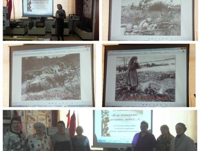 Оно было посвящено 75-летию освобождения Темкинского района от немецко-фашистских захватчиков. Мероприятие проходило в здании Темкинского краеведческого музея, где присутствовало 8 получателей социальных услуг, для которых на большом экране была представлена трагическая история Темкинского района в военные годы.