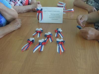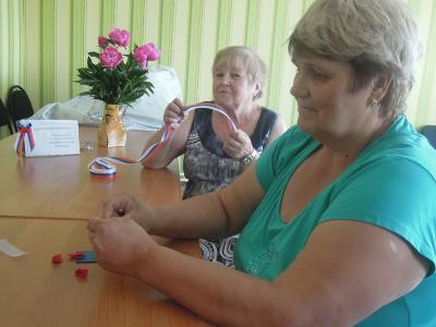Из маленьких квадратов атласа, складывая кусочки ткани, лепесточек за лепесточком рукодельницы изготавливали маленькое чудо — атласный цветок канзаши. Маленькие произведения искусства получились патриотичными, ведь для их изготовления использовали ленту «Триколор» - текстильную полосу жаккардового плетения, окрашенную в цвета государственно флага Российской Федерации. И выбор такой цветовой гаммы не случаен. Этот мастер-класс провели специально незадолго до предстоящего государственного праздника Дня России.