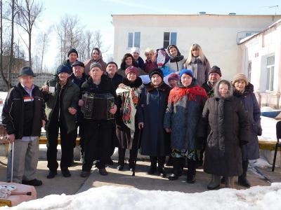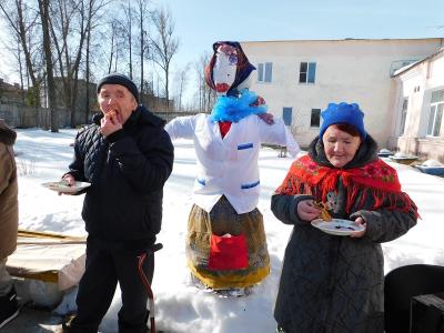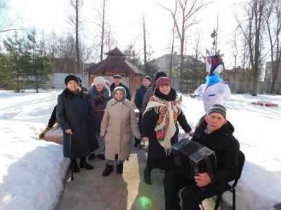 На площадке перед центральным входом развернулась игровая театрализованная программа. Были организованы различные праздничные мероприятия: проживающие слушали задорные народные песни и частушки, и сами исполняли их, участвовали в конкурсах, водили хороводы.