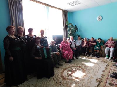 Под аккомпанемент баяниста Лапченковой Галины Ивановны ансамблем «Ивушки» исполнялись песни военных лет, песни, которые затрагивают струны души каждого: «Катюша», «День победы», «Над безымянной высотой» и многие другие. Проживающие нашего отделения с удовольствием подпевали артистам.