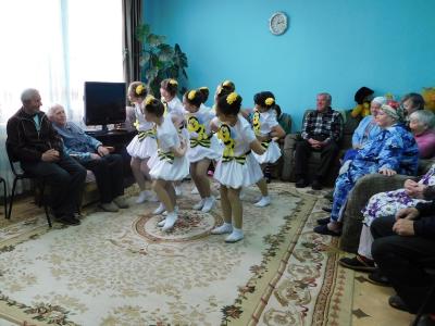 Позже поздравить нас с днем Победы пришли «Поющие звездочки» из Детского дома творчества и танцевальный коллектив исполнивший задорный танец «Пчелки». Дети пели, читали стихи от всей души поздравляли старшее поколение с этим Великим праздником.
