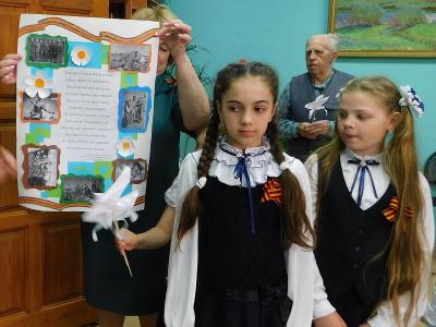 В конце своих выступлений юные артисты подарили каждому присутствующему белого голубя-символ мира, и плакат с военными фото и стихами, сделанные своими руками. Мы же в свою очередь порадовали их сладостями.