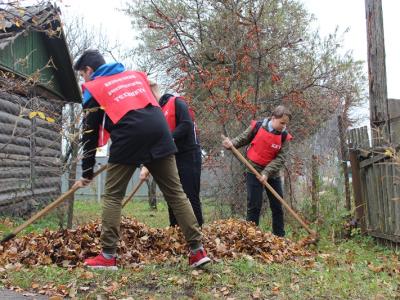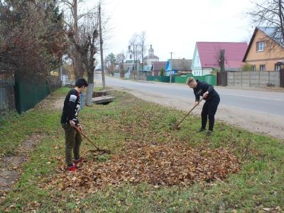 Вчетвером ребята в течении нескольких часов убирали двор и территорию перед домом от опавшей листвы, складывали ее в мешки и вывозили.