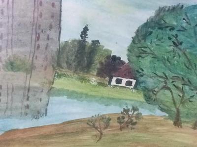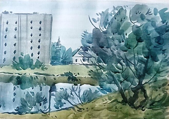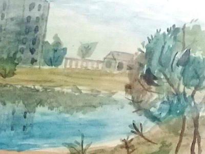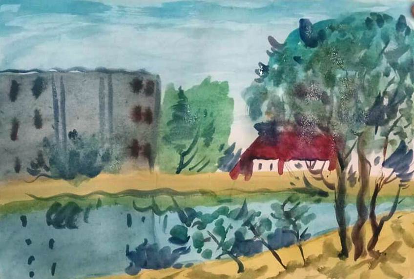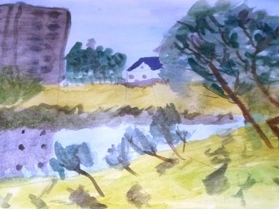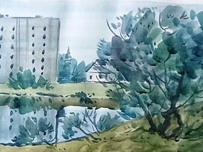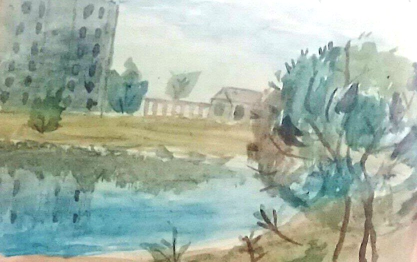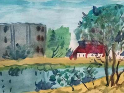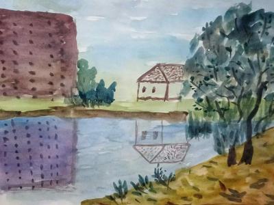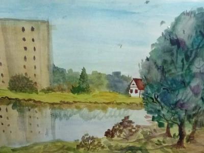 В поисках интересного сюжета участники мастер-класса отправились на озеро. Выбрали очень живописное место в городе. Перед рисующими стояла задача, передачи настроения солнечного дня, отражения деревьев и домов.