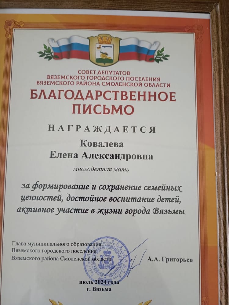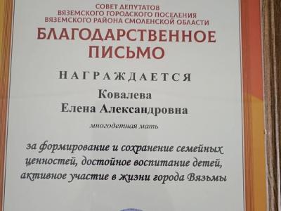 К награждению благодарственным письмом Отдела социальной защиты населения Вяземского района ко Дню семьи, любви и верности была предложена кандидатура сотрудника СОГБУ «Вяземский КЦСОН», многодетной матери Ковалевой Елены Александровны.