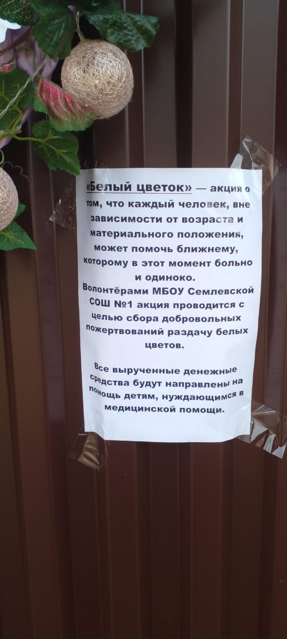 14 апреля 2023 года в селе Семлево прошла благотворительная акция под названием «Белый цветок», в которой участвовали жители села, а также волонтеры МБОУ Семлевской СОШ № 1. «Белый цветок» - акция о том, что каждый человек, вне зависимости от возраста и материального положения, может помочь ближнему, которому в этот момент больно и одиноко.