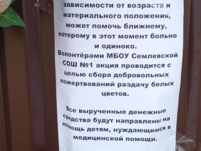 Волонтерами МБОУ Семлевской СОШ № 1акция проводится с целью сбора добровольных пожертвований и раздачи белых цветов. Все вырученные денежные средства будут направлены на помощь детям, нуждающимся в медицинской помощи.