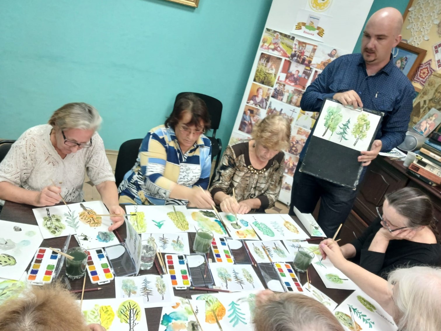 Под руководством профессионального художника, преподавателя Вяземской художественной школы имени А.Г. Сергеева Алексея Сергеевича Ионкина члены клуба сделали первые шаги по освоению техники акварельной живописи. Мастер рассказал о приёмах акварельной техники, об особенностях смешивания красок, о принципах нанесения красок на поверхность бумаги для акварели. У каждого была возможность получить профессиональный совет по поводу своей работы. Все получили удовольствие от процесса и от получившегося результата. Мастер-классы по освоению акварели будут продолжены.