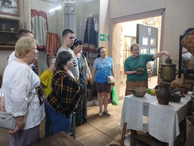 Первая часть нашей прогулки прошла в Вяземском историко-краеведческом музее. Началась экскурсия с приятного события: волонтёры С. Григорьева, В. Буркотова, В. Попова, К. Крутских, которые помогают проводить мероприятия нашего клуба были награждены Благодарностями Вяземского комплексного центра социального обслуживания населения и АНО «Культурный код».