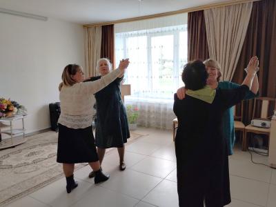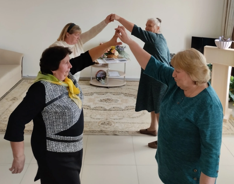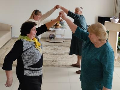 Женщины старшего возраста активно занимаются, разучивают, закрепляют комплексы упражнений, под музыкальное сопровождение.