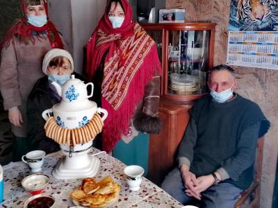В этом отдаленном районе не много получателей социальных услуг, но мы постарались собрать их всех с учетом соблюдения мер профилактики новой коронавирусной инфекции. Было организовано маленькое праздничное мероприятие «Праздник солнца – Масленица» получатели социальных услуг отгадывали загадки, слушали частушки, и сами исполняли их.