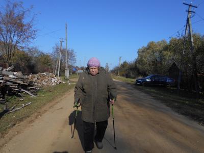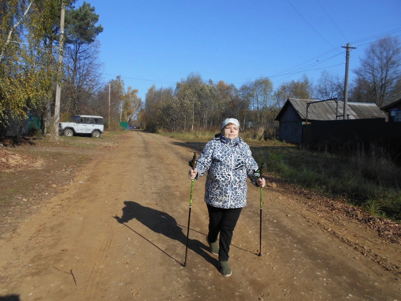 Сегодня 14.10.2022 специалист по социальной работе совершила скандинавскую ходьбу с получателем надомной службы.
