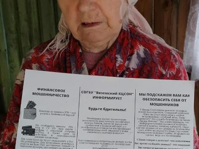 Для повышения уровня личной безопасности в повседневной жизни граждан пожилого возраста и инвалидов в рамках работы «Школы безопасности» сотрудники СОГБУ «Вяземский КЦСОН» разработали и распространили среди получателей социальных услуг информационные памятки «Телефонное мошенничество» и «Финансовое мошенничество». Данная информация была доведена до получателей социальных услуг в форме на дому, обсуживающихся нашим Центром и проживающих в г. Вязьма, Вяземском, Темкинском и Угранском районах путем вручения памятки с разъяснениями о том, как как не стать жертвой мошенников.