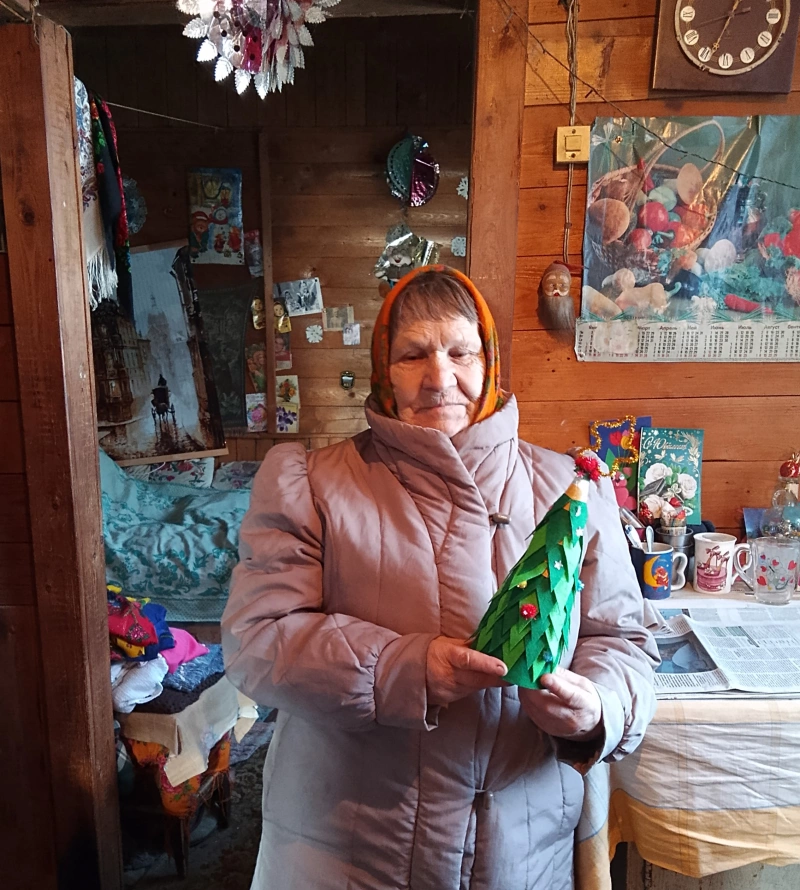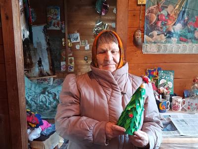 От детского сада «Филиппок» подопечная центра социального обслуживания получила в подарок новогоднюю елочку, изготовленную руками воспитанников детского сада.