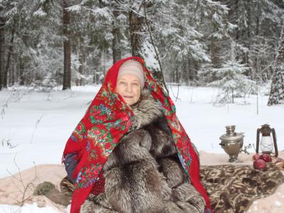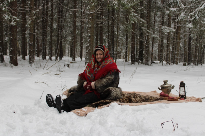 Немаловажно выбрать место, где возможно запечатлеть немало креативных фотографий. Зимний волшебный пейзаж – то, что подойдет для фотосессии. В этом году зима очень снежная и мы решили провести фотосессию на снегу. Пожилые люди с большим удовольствием позировали на природе в шубе, в платке и в варежках с красными яблоками.