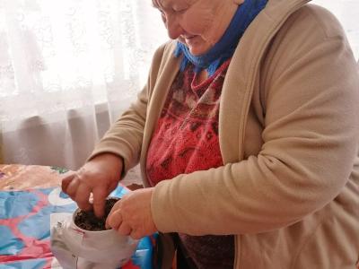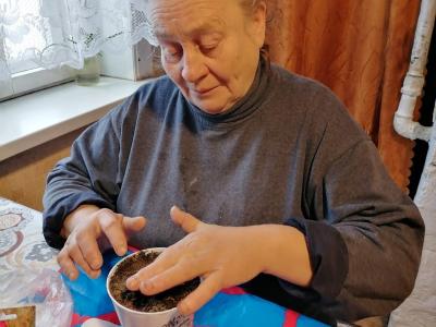 Социальные работники прочитали пожилым людям лекцию «Пеларгония - выращивание и уход в домашних условиях», а после посадили комнатное растение в горшочки. Когда растение окрепнет и подрастет получатели социальных услуг вернут пеларгонии в учреждение, чтобы в свое время порадовать юбиляров в рамках технологии «Поздравление с доставкой на дом».
